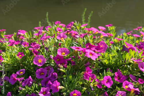 © vvicca, Fototapeta premium Bright pink flowers on a background of water surface in the sun .