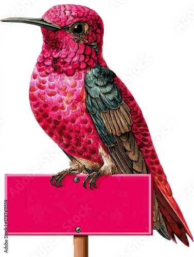 © Anastasiia, Fototapeta premium Bright Pink Hummingbird Perched on a Blank Sign in a Vibrant Setting