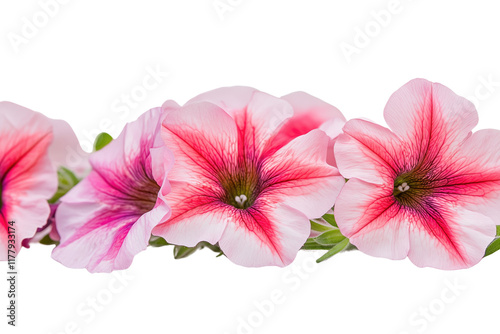 © Olga, Fototapeta premium Bright pink petunia flowers on white or transparent background with green leaves