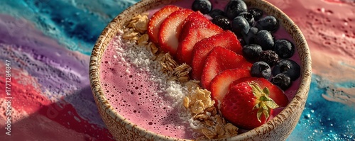 Naklejka premium Bright pink smoothie bowl with strawberries, blueberries, and granola