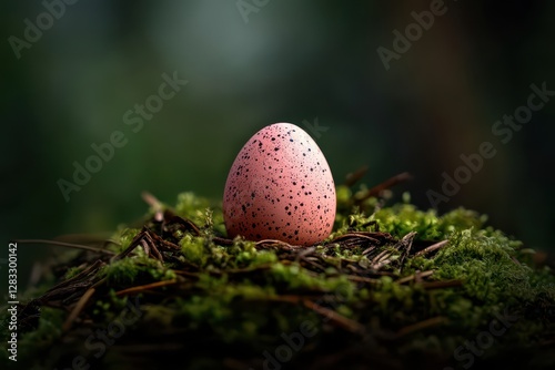 Obraz premium Bright pink speckled egg nestled in moss creates a whimsical feeling of...