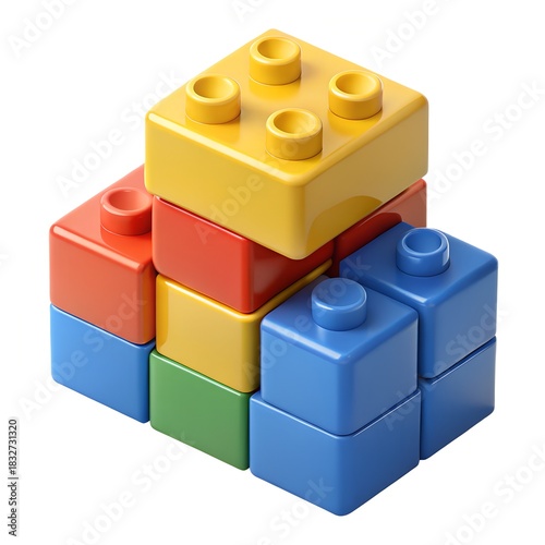© Rabia, Fototapeta premium Bright Primary Color Plastic Building Blocks Stacked on White Background