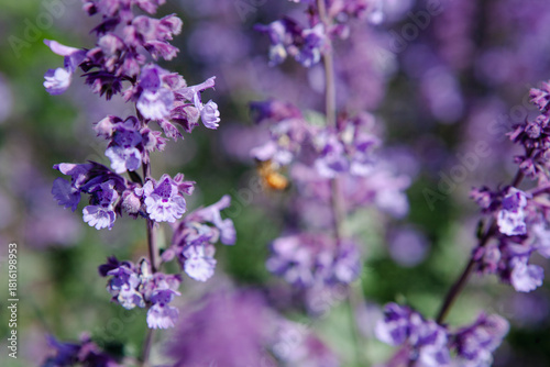 © Yana Gavriloski, Fototapeta premium Bright purple flowers with delicate white accents bloom in a garden, attracting bees as they gather nectar under a clear blue sky. The scene is vibrant and full of life