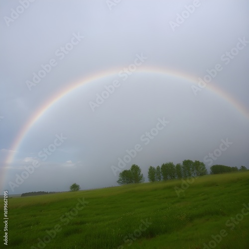 Fototapeta premium Bright rainbow appearing above a quiet meadow after rainfall.