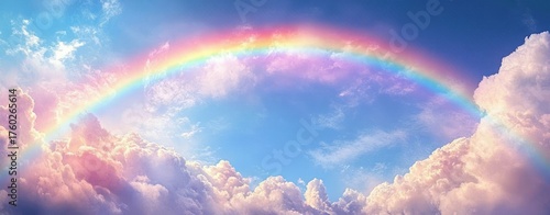 Naklejka premium Bright rainbow arching across a vibrant blue sky filled with soft, fluffy...