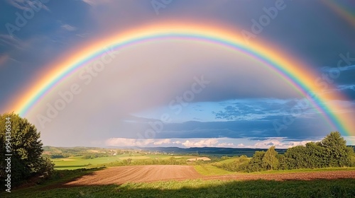 © Rainister, Naklejka premium Bright rainbow over a rural landscape after a rainstorm, colorful weather, hope and renewal