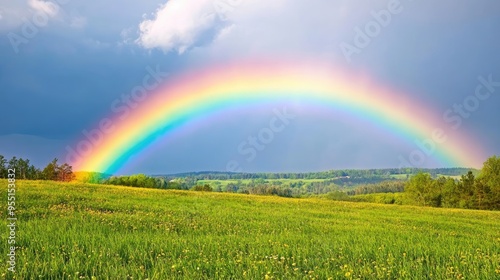 © Pannin, Naklejka premium Bright rainbow over a rural landscape after a rainstorm, colorful weather, hope and renewal
