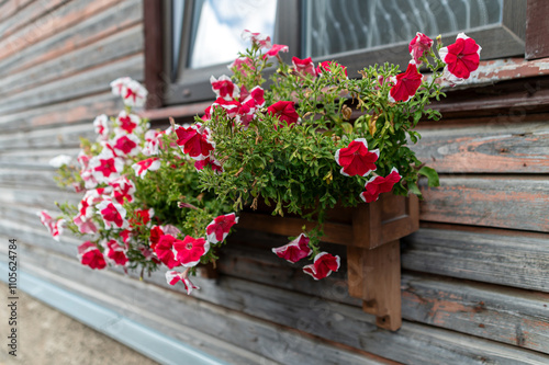 Fototapeta premium Bright red and white petunias cascade from a wooden planter along a charming old building.