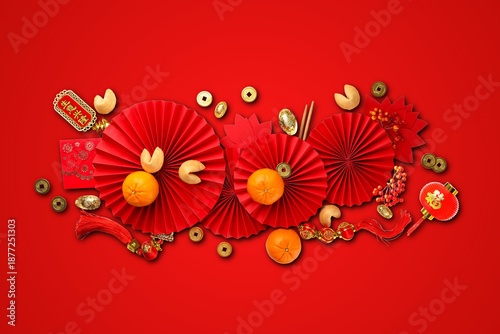 © Atlas, Fototapeta premium Bright red decorations celebrate Chinese New Year with oranges