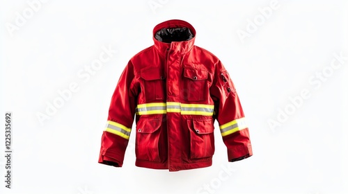 © ธนากร บัวพรหม, Obraz premium Bright red fireman jacket with reflective stripes, designed for safety and visibility during emergency response situations, on a white isolated background.