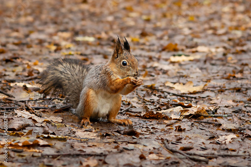 Fototapeta premium Bright red fluffy squirrel on the background of fallen leaves natural background