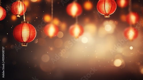 Fototapeta premium Bright red lanterns hang elegantly against a softly lit background during festive celebrations