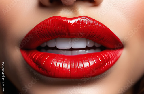 Obraz premium Bright red lipstick on female lips. Beautiful female lips. White teeth. Body...