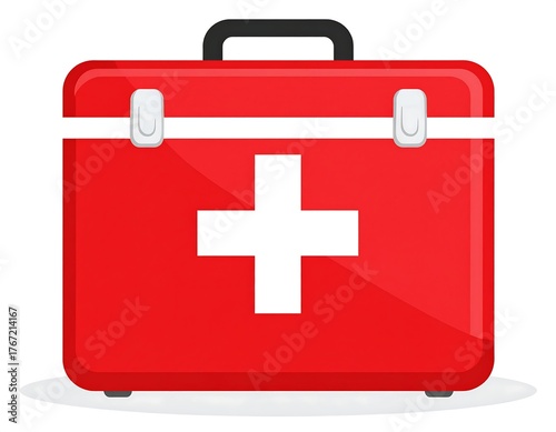 © Tati, Obraz premium Bright red medical box with a white cross, handle, and metal clasps