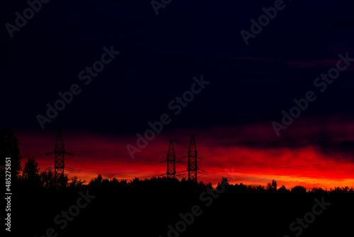 © Алексей Ромадов, Fototapeta premium Bright red order and electric transmission towers