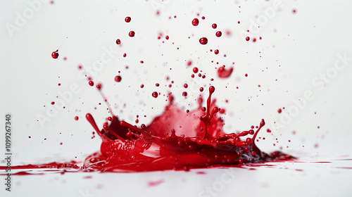 Fototapeta premium Bright red paint exploding on a pristine white background, droplets frozen in mid-air, emphasizing the stark color difference.