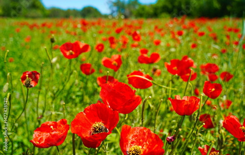 Fototapeta premium Bright red poppies in a large field. Spring.