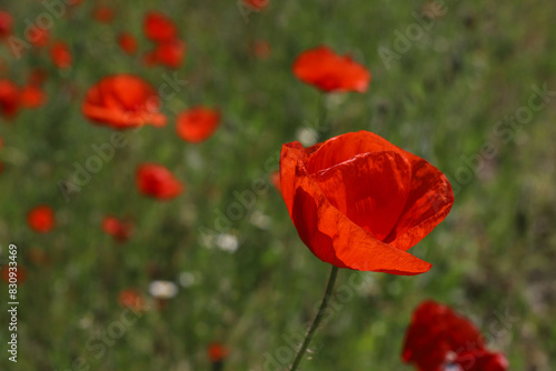 © Наталья Николаева, Obraz premium bright red poppies on a green background in sunny weather