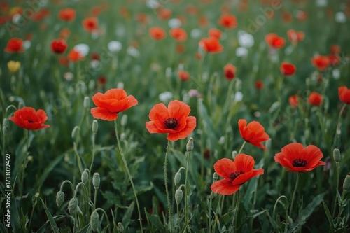 Obraz premium Bright red poppies thriving in a verdant meadow during a serene spring dusk.