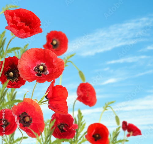 Fototapeta premium Bright red poppy flowers under blue sky