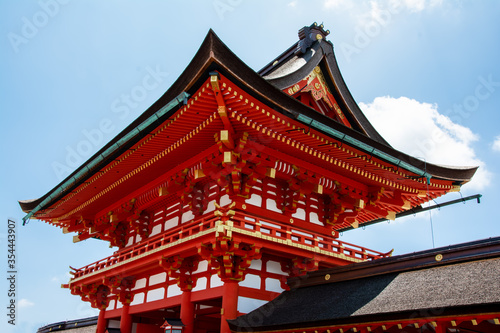 © ChristyLangPhotos, Obraz premium Bright, red religious pagoda with gold trim in Tokyo, Japan against a blue sky with puffy clouds.