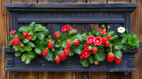 © Fleuronica, Naklejka premium Bright red strawberries and colorful flowers on a rustic black wooden shelf in a garden