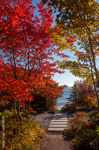© Ann Stryzhekin, Naklejka premium Bright red trees on the lake in the autumn park.