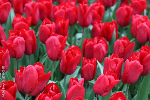 Obraz premium Bright red tulips in a spring garden