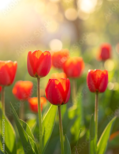 © Akun, Fototapeta premium Bright Red Tulips in Sunlit Garden