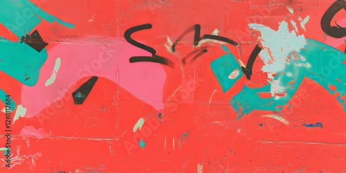 Naklejka premium Bright red wall adorned with vibrant graffiti and a rough grunge texture in...