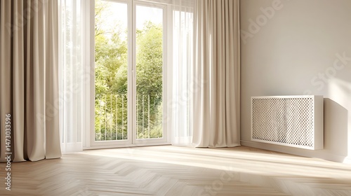 © Creative Laik, Fototapeta premium Bright Room Interior with Balcony Doors, Beige Drapes, Parquet Floor and Radiator Cover