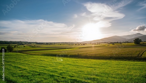 Fototapeta premium Bright rural landscape featuring farm fields and meadows, suitable for...