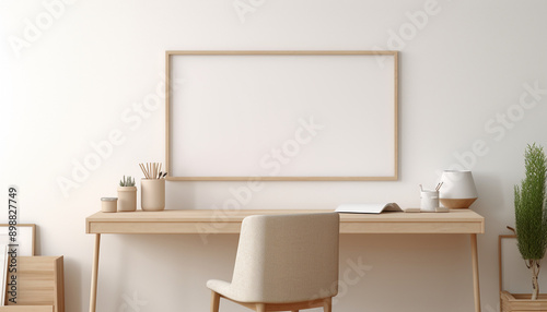Obraz premium Bright Scandinavian home office white walls with empty frame