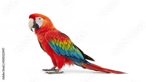 © pngking, Fototapeta premium Bright Scarlet Parrot in Enclosure, Rear View, Isolated Against White