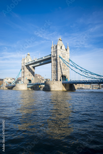 Obraz premium Bright scenic view of Tower Bridge standing in blue sky above the River...