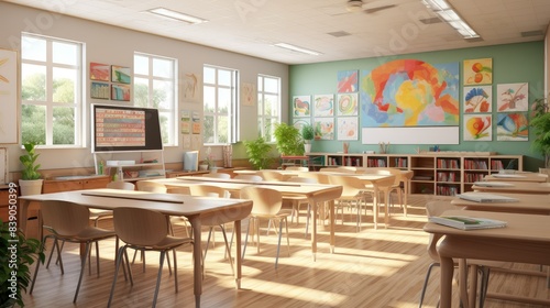 © Hafidhulkarim60, Fototapeta premium Bright school classroom with all chair facing forward
