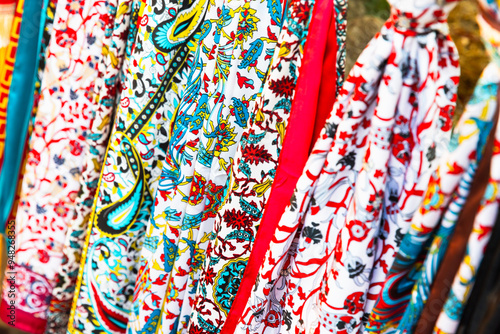 Fototapeta premium Bright shawls with colorful patterns. Assortment of a gift shop