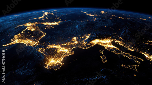 Fototapeta premium Bright shining cities of Europe contrasted against dark rural areas in a satellite view at night depicting electricity consumption and urban density