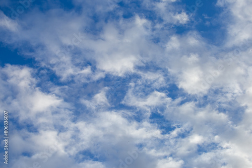 Fototapeta premium Bright sky texture background with white clouds, pleasing to the eye.