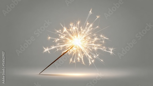 © Generative AI, Naklejka premium Bright Sparkler Firework Exploding with Glowing Light and Sparks on Gray Background.