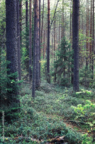 Fototapeta premium Bright spring greens at dawn in the forest. Nature comes to life in early...