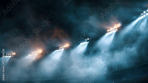 © Pickoloh, Fototapeta premium Bright stadium lights illuminating a foggy atmosphere.