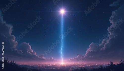 Fototapeta premium Bright star above night city lights. Blue lightning bolt connects celestial body to planet earth. Starry sky with clouds, cosmic energy flows.