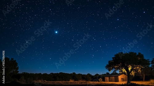 © Irina, Fototapeta premium Bright stars fill the night sky above a small building in a quiet landscape