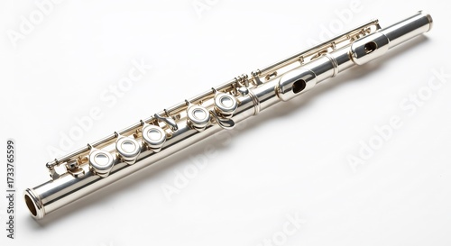 © Duc, Fototapeta premium Bright studio light illuminates a sparkling silver flute showcasing its metallic keys on a clean white backdrop