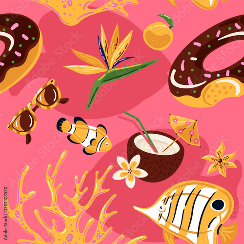 Naklejka premium Bright summer pattern with corals, flowers, fish, donut inflatable and coconut cocktail.