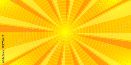 Fototapeta premium Bright Summer Yellow Sunburst Comic Background with Radial Halftone Dots