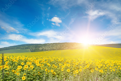 © Serghei V, Obraz premium Bright sun above sunflower field.