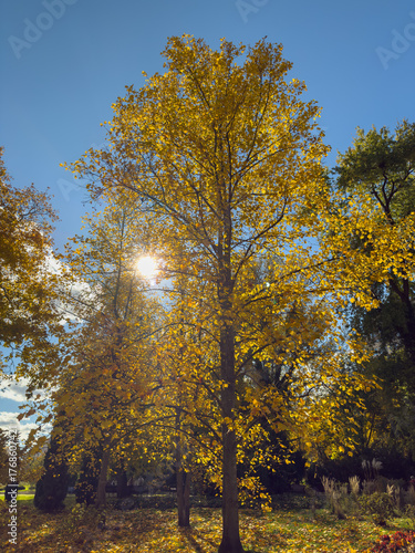 © devilvet, Fototapeta premium Bright Sun Flare Golden Autumn Tree Canopy