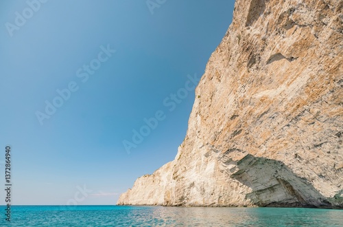© Damian, Fototapeta premium Bright sun illuminates towering cliffs above serene blue waters, showcasing the natural beauty of Greece in a peaceful summer landscape ideal for relaxation and exploration